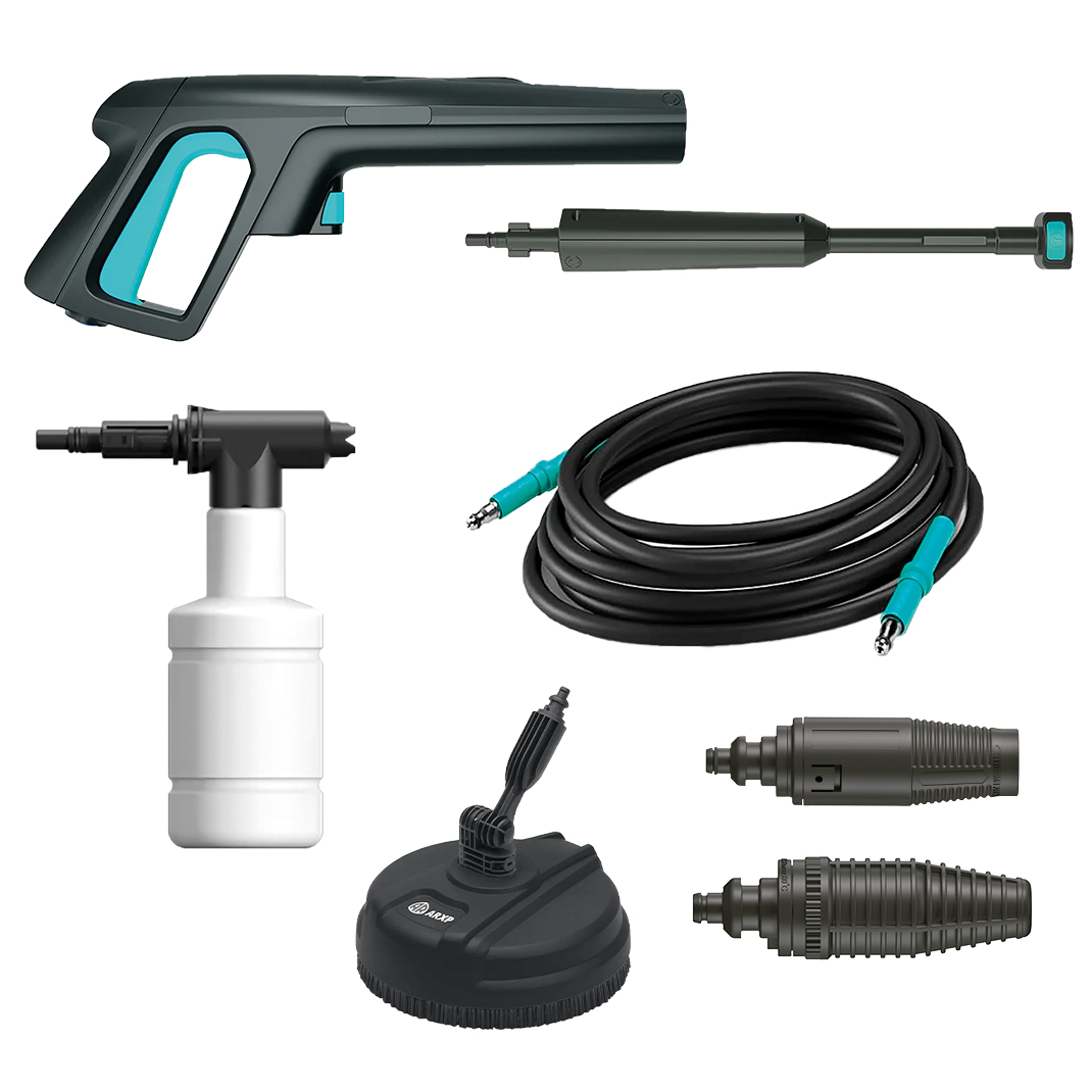 Pistola, lanza, kit lanza espuma, manguera, boquillas y patio cleaner